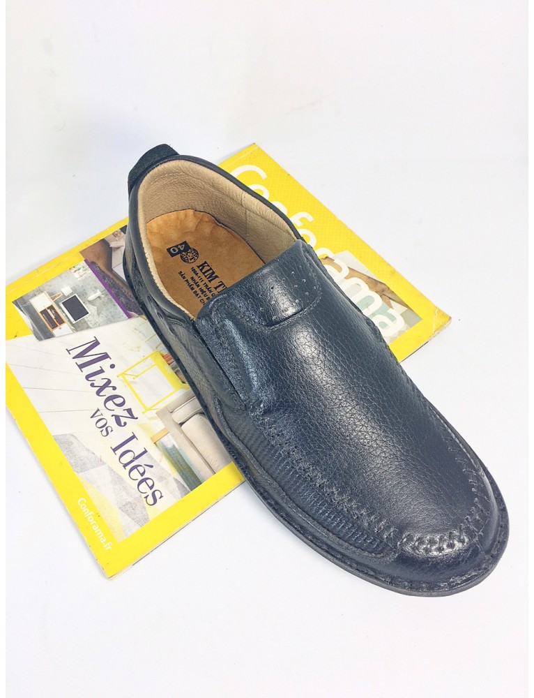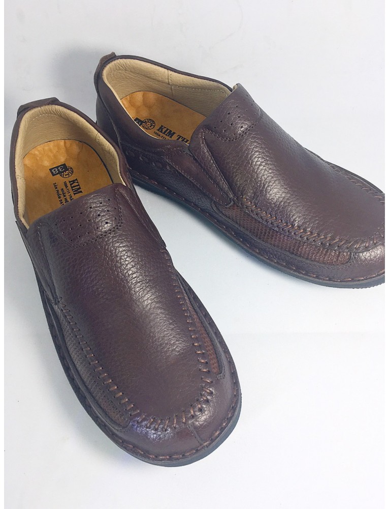 Giày da Kim Thành, thương hiệu độc quyền. Giày tây mọi xỏ được thiết kế chỉ từ một mảnh da cấp nguyên bản, tạo cảm giác liền mạch và hoàn hảo đến từng chi tiết. Đây cũng chính là điểm đặc biệt làm nên điểm nhấn tinh tế rất riêng của mẫu giày này. Cấu tạo của phần đế cao su với những đường may tỉ mỉ và khéo léo, sở hữu các rãnh chống trơn trượt hiệu quả, giúp phái mạnh dễ dàng di chuyển và hoạt động. Giày mọi xỏ rất sang trọng cho phái nam tham dự các sự kiện, du lịch, công sở.
